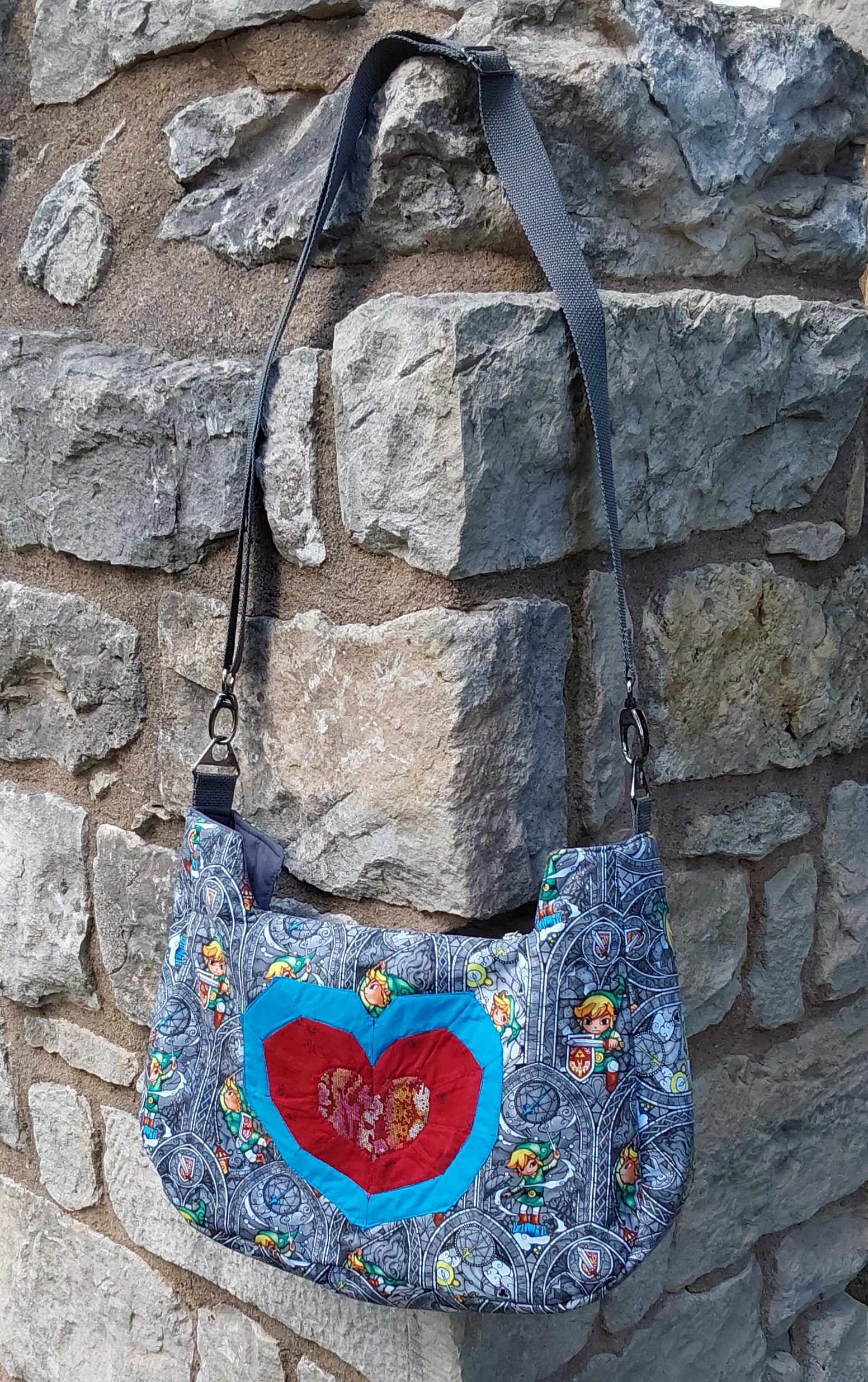 This Zelda inspired Belcourt Bag features Link with various tools from the Wind Waker game, as well as a hand-sewn heart container patch. The main pocket is zippered, there is a smaller zippered pocket on the side to hold your rupees, and an elastic strap on the inside will easily hold a bottle of Lon Lon milk, or a water bottle, if that's what you're into.
