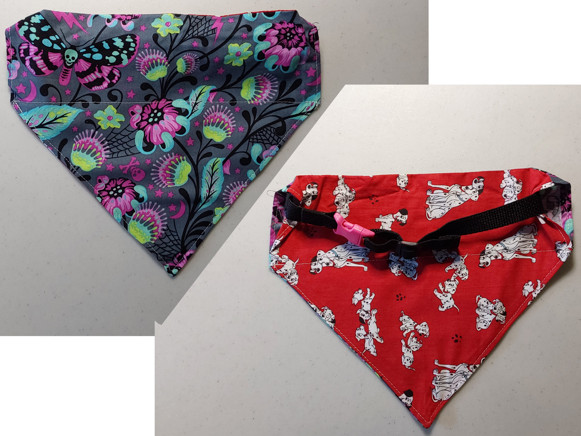 Our bandanas come with collars made of webbing (think backpack straps), a clip for easy dressing and undressing, and a triglide slide. The slide makes the collar adjustable.