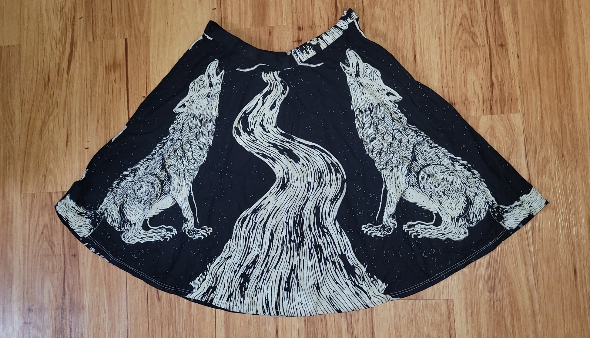 Anyone who likes tarot might recognize this as The Moon card. This one-of-a-kind skirt features a glow in the dark moon on the front, and wolves on the back.