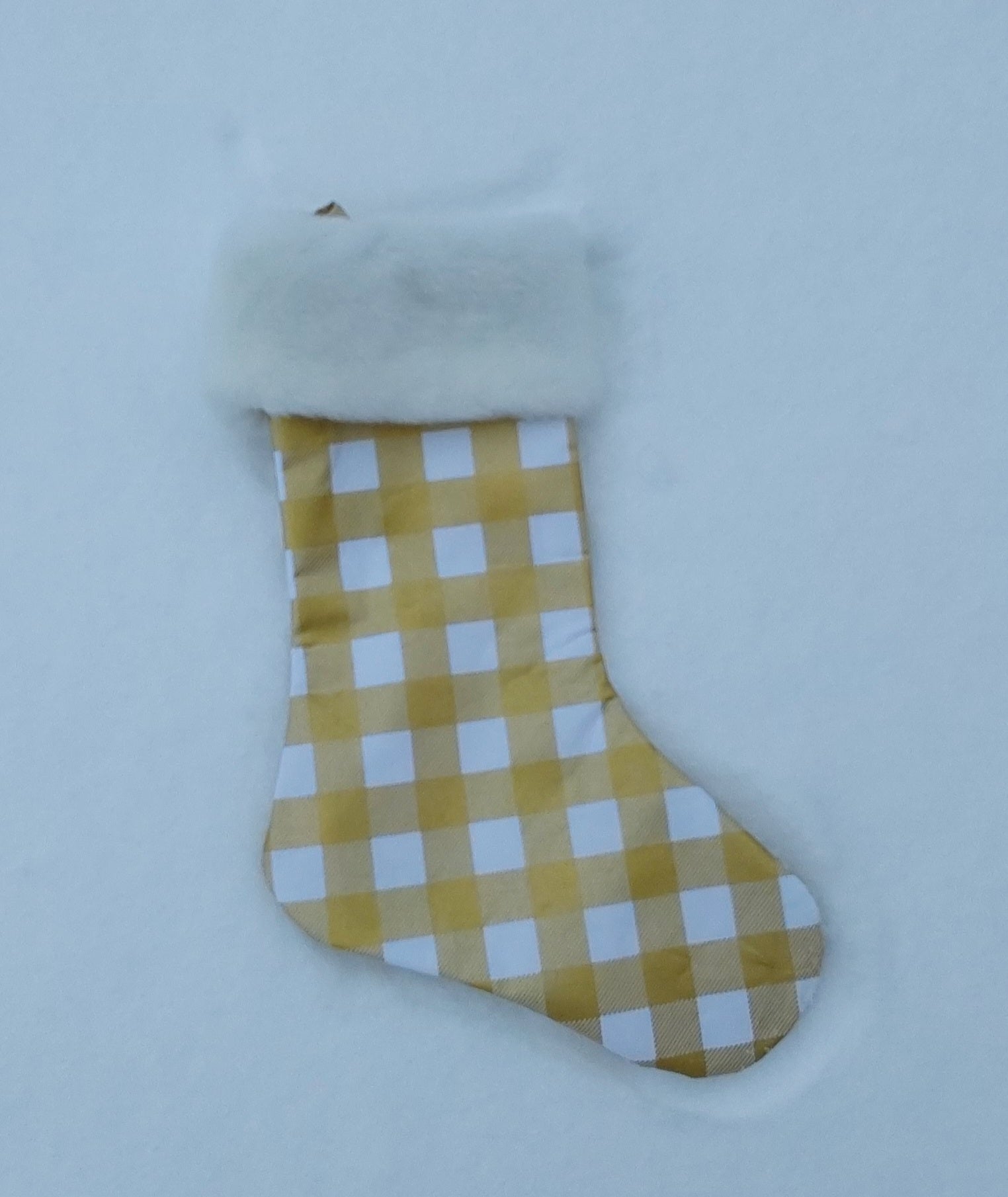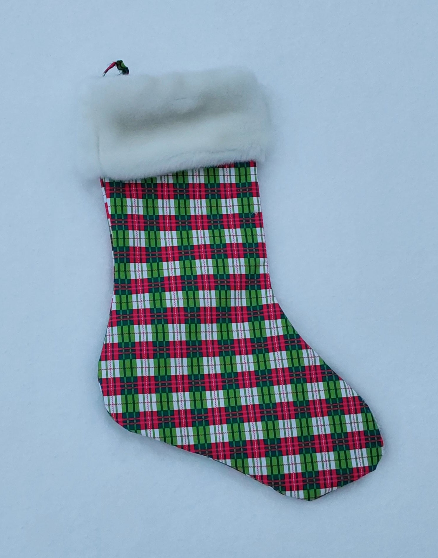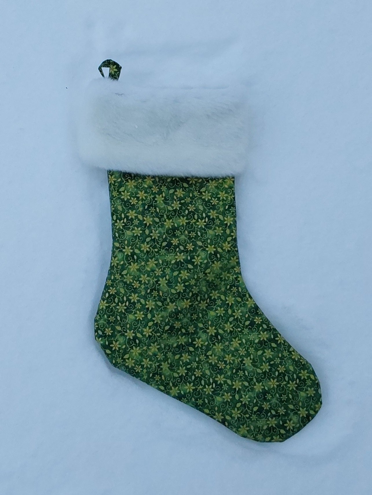 Stockings feature a cotton loop for hanging, and a white, fur cuff. Interiors are black or white.